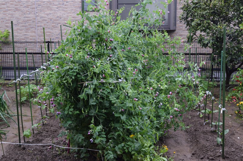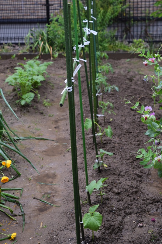 エンドウ、ジャガイモ、なす、キュウリ、トマトを植えました。