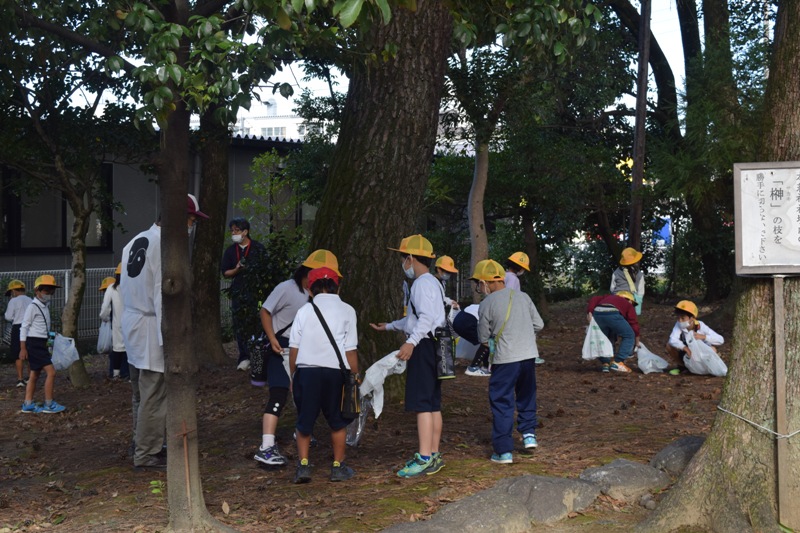 本荘神社に本荘小学校の1年生がやってきました。松ぼっくりやどんぐりを拾っていきました。