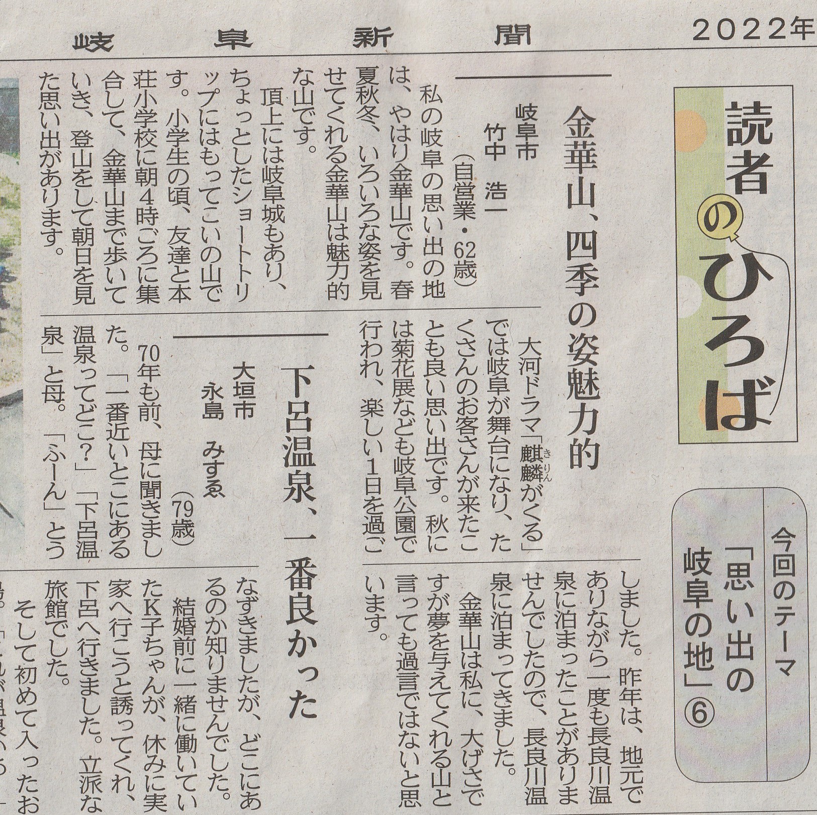 聞に載りました。題は思い出の岐阜の地です。